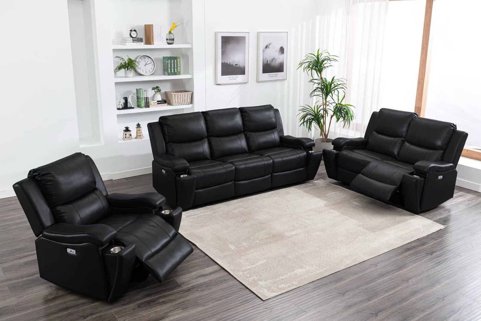 Experience unmatched luxury and relaxation with this 3-piece power recliner set in sleek black leather gel and also with grey fabric. Designed for comfort, durability, and modern style, each piece offers powered reclining, ergonomic support, and built-in tech features that make every seat the best seat in the house.